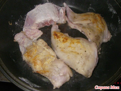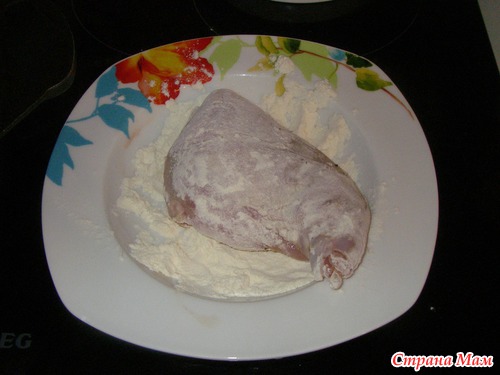кусочки обвалять в муке, излишек стряхнуть, мука придаст нужную густоту и лёгкий ореховый привкус соусу