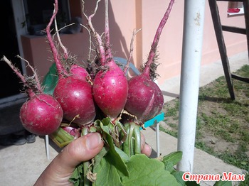 А это огурцы. На 7 метрах при ширине 45 см по центру посажены 8 огурцов. Над ними натянута пластиковая сетка. Вертикально. Это сделано для того, чтобы солнце доставалось обеим сторонам грядки, т. к. слева у нас растет салат, видно как уже окреп лук на головку посеяный семенами. А справа - редиска, укроп и свекла. Давайте посчитаем что нам дадут эти 3.5 м2. С 8 кустов огурцов посаженных таким образом я в прошлом году засолила 56(!!!) литров карнишонов. + укроп+лук+редиска+укроп которые никто не считает весь сезон + около 5 кг свеклы. ПУсть в меня кинут тапком, если со стандартной грядки 1.5 Х2 м соберут столько же!