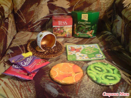 Еще была чудесная открыточка с подставочками под горячее, тоже сделала Анюта сама из дисков!! Они двусторонние!!