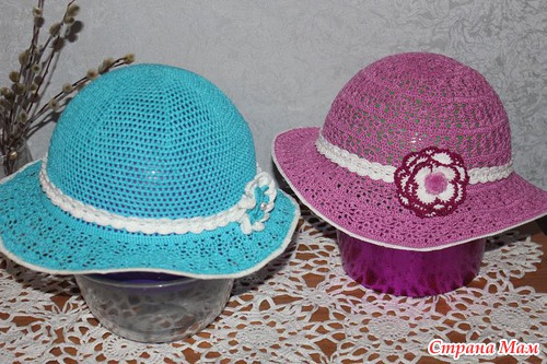 Шляпка вязалась по онлайну шляпки"Пушистые ромашки"- https://www.stranamam.ru/post/5123464/ Чтобы шляпки держали форму, я их сначала намочила в воде, отжала, а затем в растворе желатина - на 1ст. воды 1ст. л. желатина. Затем снова отжала и натянула на надутый до нужного размера шарик. В картонке вырезала отверстие по объему головы, вставила туда шарик(до половины)с натянутой шляпкой и поставила это сооружение на миску(нижняя часть шарика в миске). Поля слегка растянула и приколола к картонке булавочками (зафиксировала). Дала высохнуть( у меня за ночь высохло).1ст. раствора желатина мне хватило на обе шляпки.