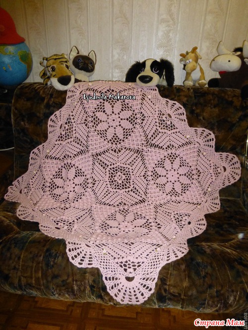 Плед ручной работы, выполнен крючком. Легкий, воздушный, очень мягкий. Для девочки в коляску или кроватку. Пряжа BAMBINO 25% шерсть, 75% акрил, 130 м, 50 гр. Классическая пряжа с 25% содержанием шерсти, мягкая на ощупь, подходит для вязания детских вещей. Читать полностью