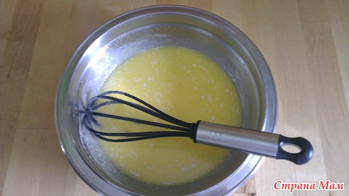 Растопим 200 гр. маргарина для выпечки, добавим в него 150 мл. холодного молочка... дадим еще немного остыть... и смешаем это всё со взбитым яицом... вот так: