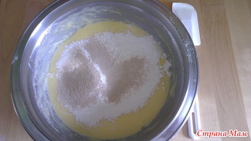 Короче, просеяли немного муки сверху и высыпали на муку пачечку сухих дрожжей (у меня на пакетике стоит - на 500 гр. муки)...