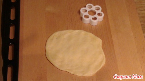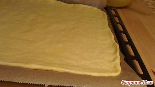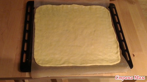 Теперь маленький кусочек убираем в уголок, а большой разминаем на противне, выстланном бумагой для выпечки.