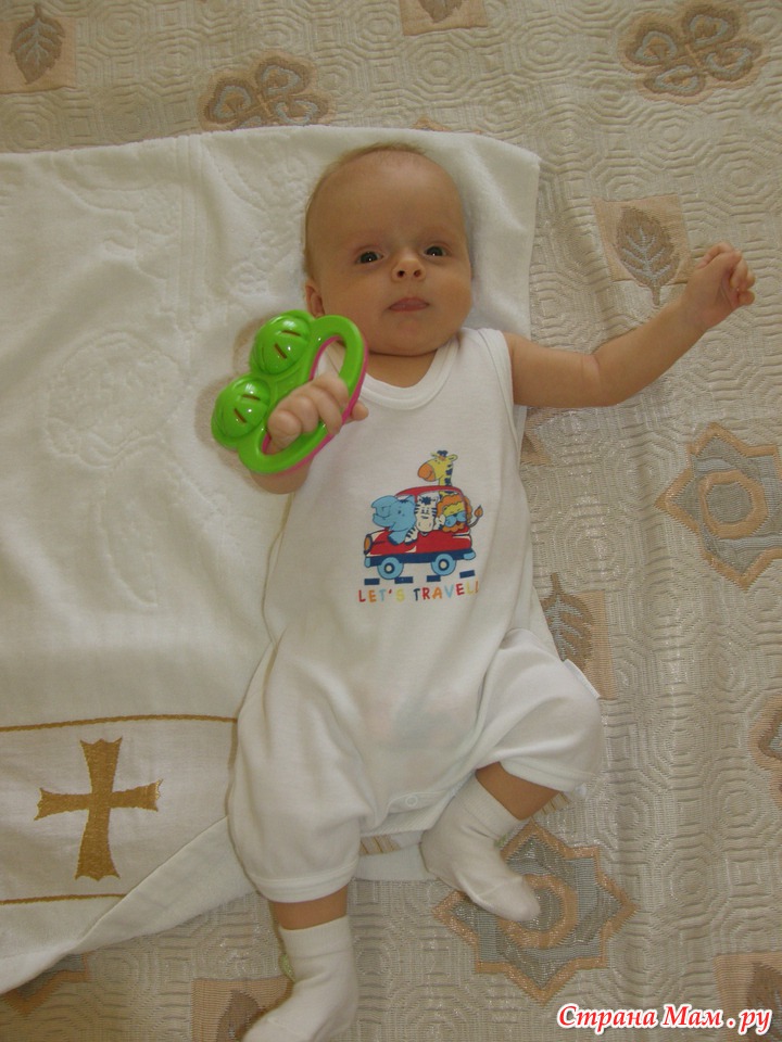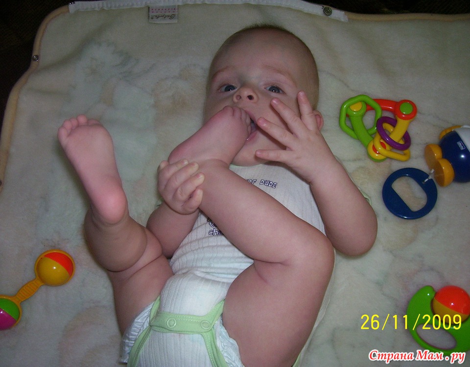 Четвертый месяц! Так, поговорим о наших успехах . Уже умеем крутиться, переворачиваемся со спинки на животик. Теперь глаз да глаз за ним нужен. А еще стали лепетать, так здорово! Естественно полюбили "ручки". Теперь так просто не отделаешься, на ручках любим гулять по дому разглядывая всякую всячину, ну и пробовать все на вкус, не без этого . Вообще мальчишка очень любознательный . Улыбаться просто обожает. Всегда, когда я на него поворачиваю голову, то тут же следует лучезарная улыбка сыночка .