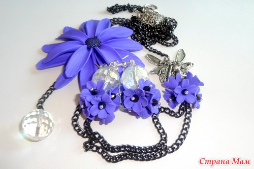 Приветик девочки! Показываю вам плод моих двухдневных страданий))) Этой работой открываю небольшую серию работ, схожей по цветовой гамме - Сиреневый вечер. Сегодня представляю вам комплект к вечернему платью - "Сиреневая фея". Он состоит из колье и серег. Полимерная глина, цепочка, бусинки из хрусталя, фурнитура под серебро.