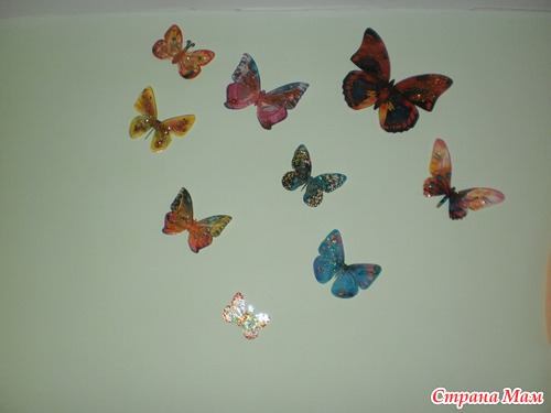 Значит бабочки были найдены в инете, распечатаны на принтере, наклеены на пенопласт(потолочные плитки, куплены специально гладкие), покрыты лаком и засыпаны разнообразными блестками, приклеены на двусторонний скотч.