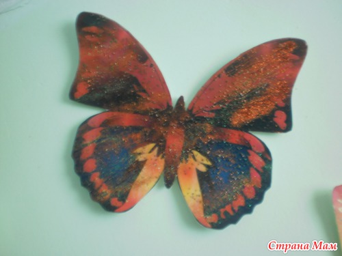 Значит бабочки были найдены в инете, распечатаны на принтере, наклеены на пенопласт(потолочные плитки, куплены специально гладкие), покрыты лаком и засыпаны разнообразными блестками, приклеены на двусторонний скотч.