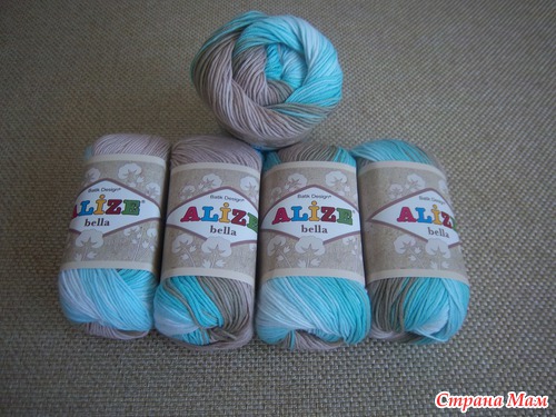 Я вязала из пряжи Белла Батик от "Ализе" цвет 3675 (100% хлопок,50 гр на 100 м )крючком №2,5 №3 и №3,5, ушло меньше мотка, грамм 40. На цветочки пряжа секции выгадывала из Беллы, белой Сосо, и небесно-голубой ЯрнАрт.
