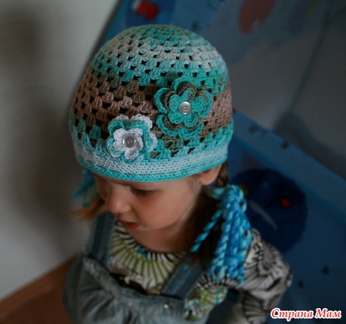 А вот и наша шапочка (связала 3 цветочка, но сначала шапочка была с 2 цветочками, потом решила пусть будут 3 )