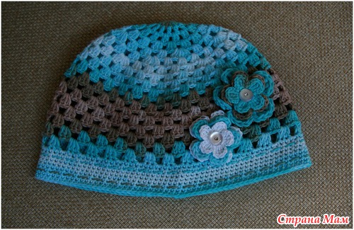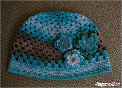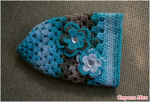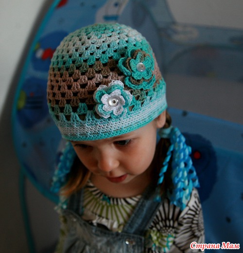А вот и наша шапочка (связала 3 цветочка, но сначала шапочка была с 2 цветочками, потом решила пусть будут 3 )