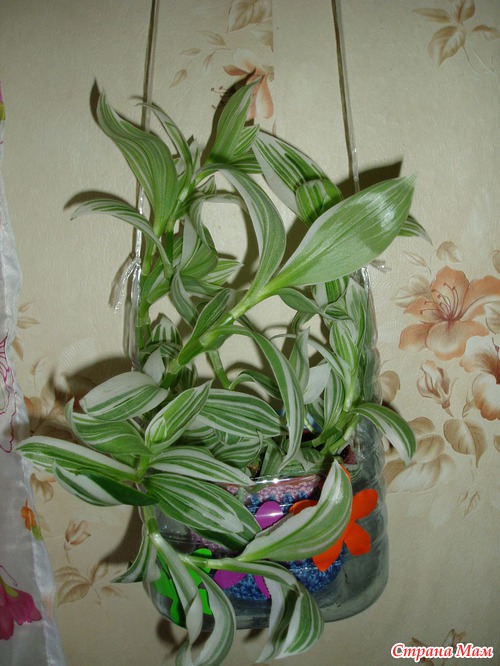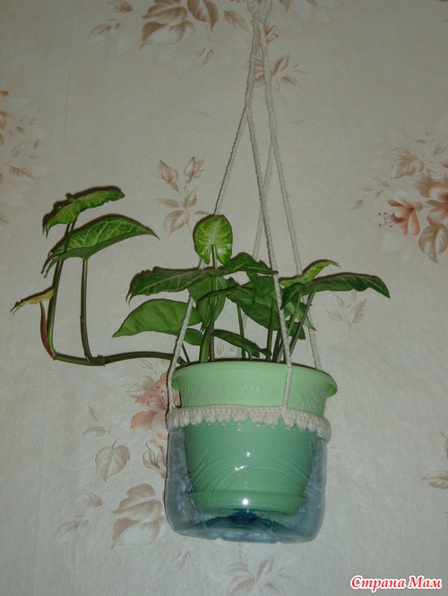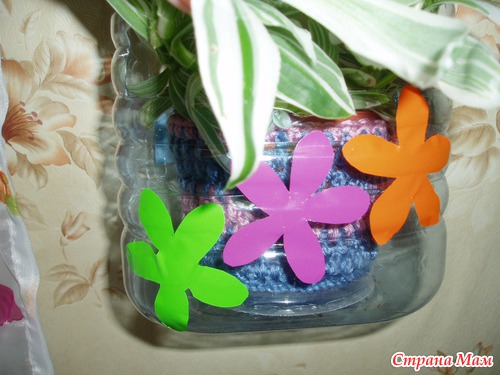 Чтобы сделать такое кашпо, мне пришлось вырезать переднюю и заднюю части бутылки, а на боковушках прорезать дырочки, протянуть в них тесьму и подвесить. Украшал мой сынуля, цветочки вырезаны с самоклейки. Также можно покрасить краской с балончика.