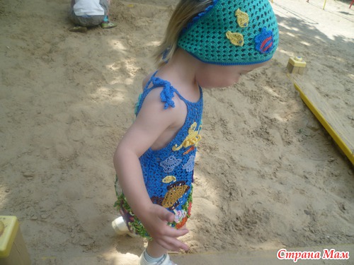 Принимайте как есть - цвета у меня поярче чем в журнале были, вязала из итальянского хлопка фило ди скозия №5 225м/50г - 14 цветов всего, основного 2 моточка, сарафанчик получился 180г. косынка 40 г. Барышня моя 2.5 лет отроду, но мелковата - рост 86 см. (Это чтобы прикинуть на какого ребенка сколько грамм понадобится).