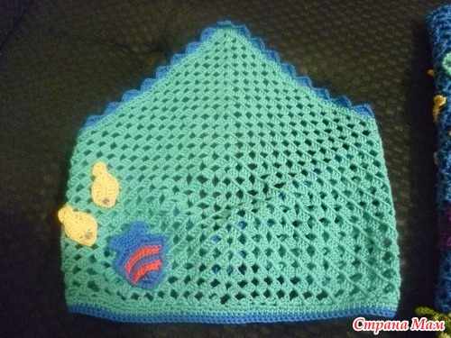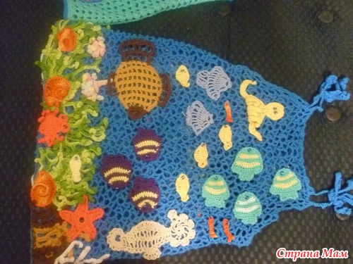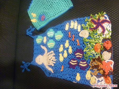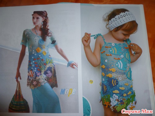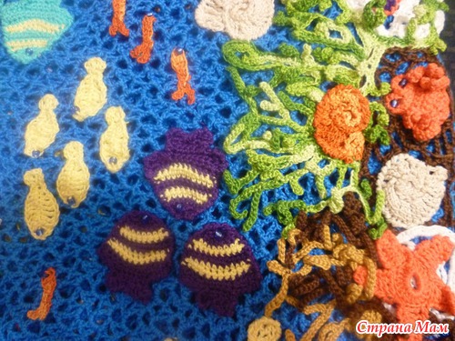 в таких моделях нет повторов - сколько не пытайся, не получится. Она каждая индивидуальна, что и прекрасно! Я старалась вроде все как в журнале, но рыбки меньше получились, может пряжа тоньше была, а водоросли наоборот - в оригинале разные толщины пряжа была, поэтому и разнооразила рыбками другими и медузами(благо в сети можно кучу схем найти