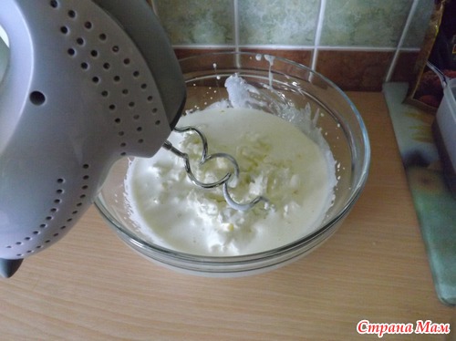 В эту массу вводим маскарпоне. Весь. Я это делаю другими насадками на миксере на минимальной скорости. Или просто ложкой.