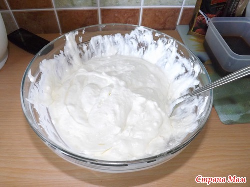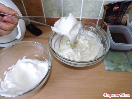 Перекладываем взбитый белок в нашу маскарпоновую массу. Аккуратно, ложкой, движениями снизу вверх, чтобы белок не опал.