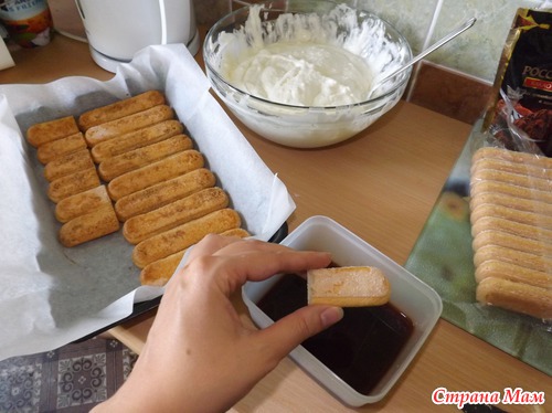 Далее берем емкость с кофе и уверенно и быстро обмакиваем дамские пальчики. НЕ погружайте всю палочку, иначе совсем размокнет! Движение быстрое и поверхностное, с обеих сторон!
