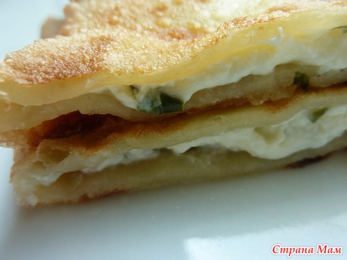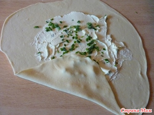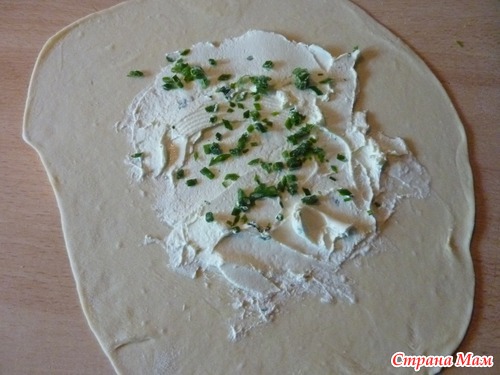 тонко раскатала, намазала сыр филадельфия и посыпала мелко порезанным зеленым лучком