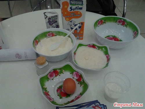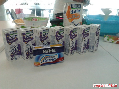 На столах стояли вот такие наборы продуктов. Т. к. молоко очень жирное - 6% - то масло в него добавлять не нужно. Так нам сказал ведущий. Еще там были фартучек и полотенце.