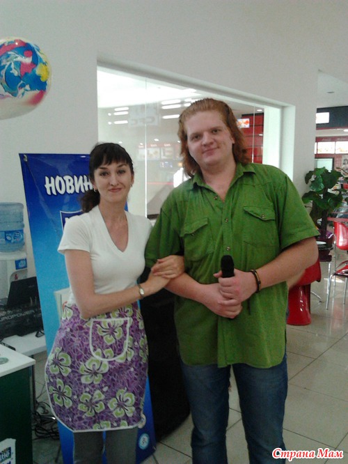 Пока мы пытались правильно ответить на вопросы, тем временем я делала тесто. Отнесла его поварам, и сфоткалась с ведущим. (вот на мне фартучек от Nestle).