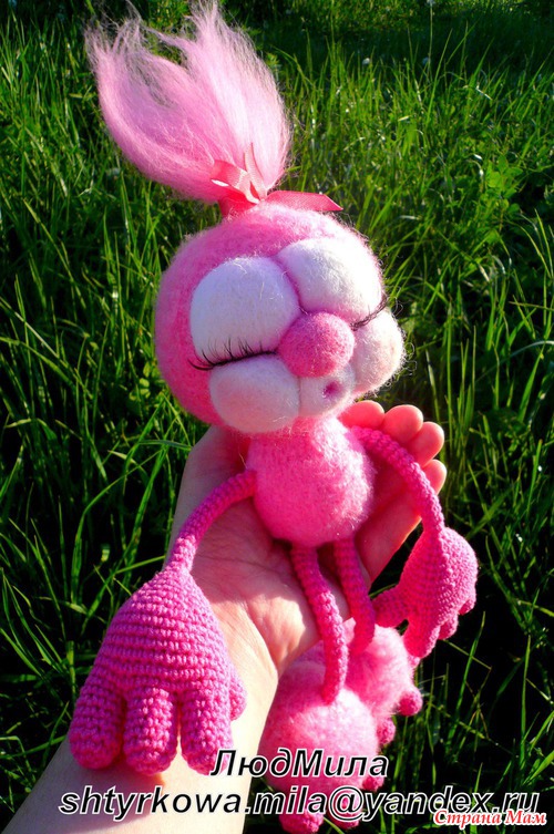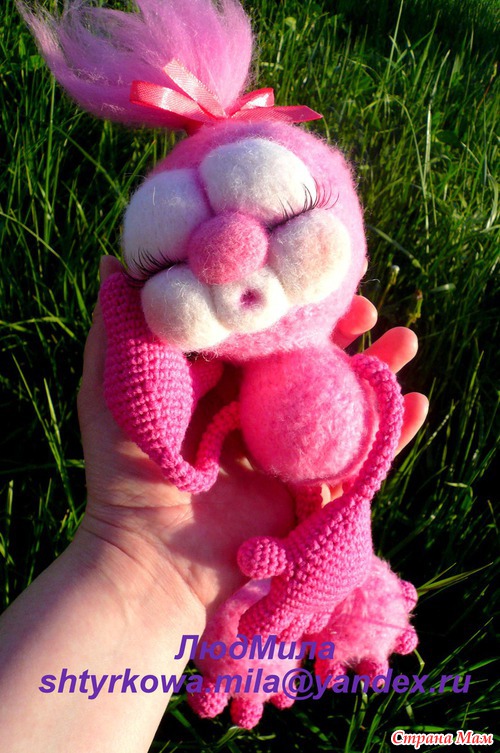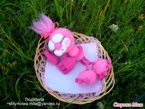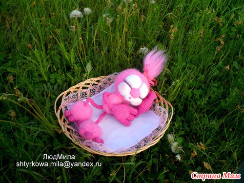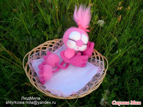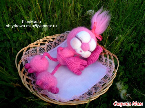 Связана из пушистой мягкой ниточки, в руках держать одно удовольствие. Корзиночка ручной работы, из настоящих веточек. Жаль что фото не может передать всю прелесть игрушки.Продаётся. Цена здесь http://www.livemaster.ru/item/3427923-kukly-igrushki-spyaschee-rozovoe-chudo