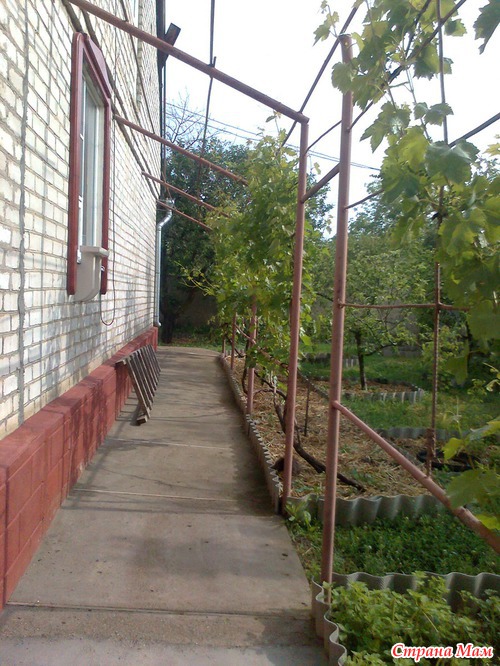 Беседка за домом. Грядка с виноградом шириной 80 см. В эту грядку я посадила тыкву. Виноград на этой беседке ранний. Четыре сорта раннего винограда.