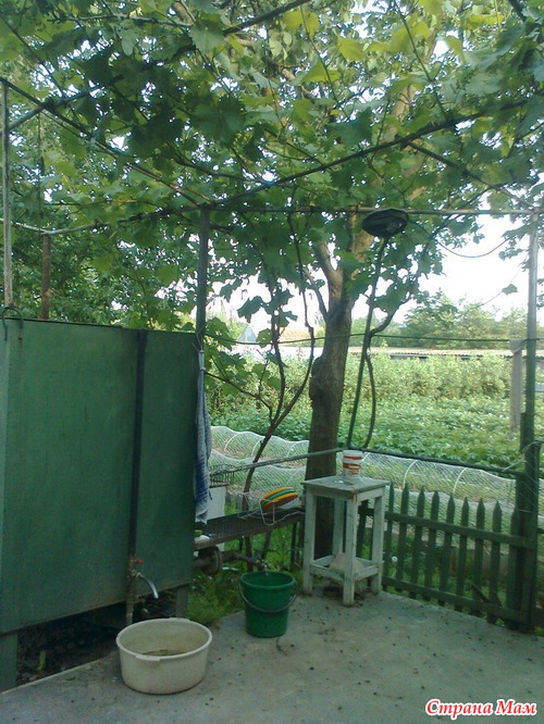 Третья беседка. Виноград над "рабочей зоной". Слева бак на 2 кубометра воды. Это резерв питьевой воды, на случай, если отключат воду. На этом пятачке у нас четыре крана. Два крана от трубопровода питьевой воды и два крана от бака.