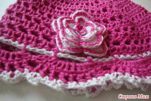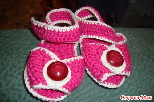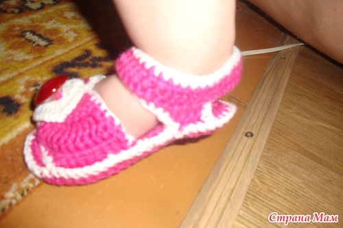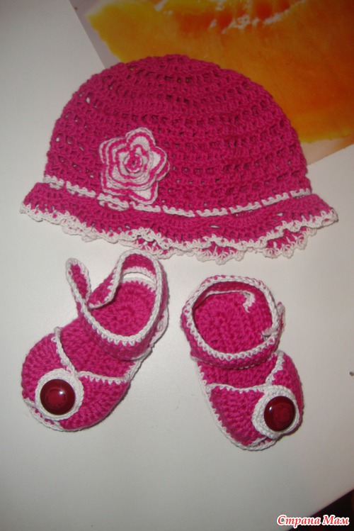 Погода стала очень жаркая, вышли с дочей погулять- а на ножки и на головку супер-легкого ничего нет, прошлась в 2 детских магазина- на такой возраст ни панамочек ни тонких носочков не обнаружила. Пришлось в срочном порядке доче панамочку и пинетки-босоножки сообразить. Авторского ничего нет, все подглядела в СМ, немножко по-своему украсила.
