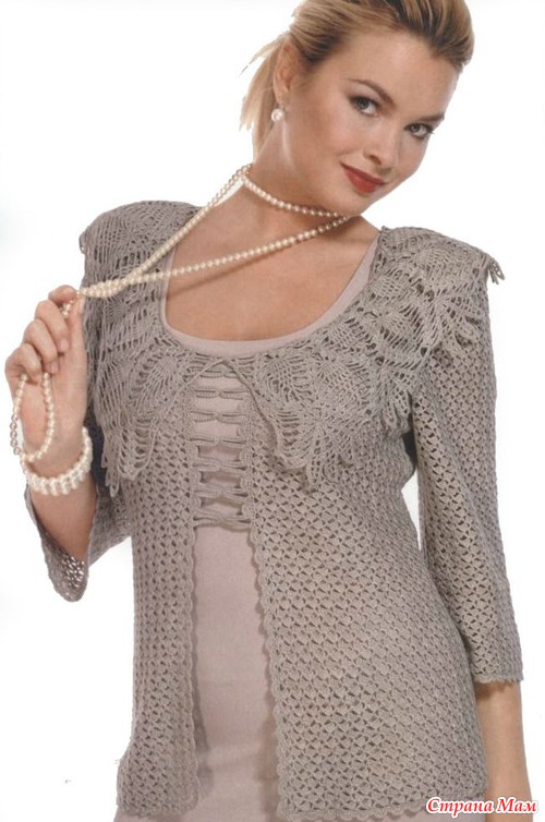 Обвяжите вертикальные края воротника СБН. Пришейте воротник к горловине. Обвяжите борта, низ изделия и нижние края рукавов фестонами: * 1 СБН, пропустить 3 петли, 6 С2Н в одну петлю, пропустить 3 петли *, вязать от * до *. У горловины по бортам выполните длинные петли для застежки. Для этого прикрепитесь СБН между фестонами, провяжите 16 ВП и прикрепитесь, пропустив фестон. Обвяжите эту петлю 20-ю СБН. Пришейте к петле по правому борту крючок, а на симметричную ей по левому борту петлю для крючка.
