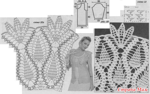 Обвяжите края изделия СБН. По схеме 32 свяжите кружевной воротник. Для этого на цепочке ВП заведомо большей длины свяжите 12 раппортов узора по схеме 32 а. Далее свяжите все ряды схемы.
