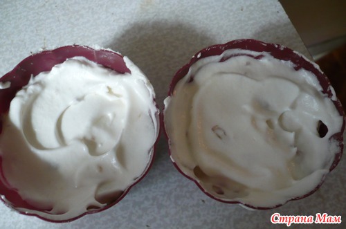 5 - в формочки ( чтобы можно было использовать в свч ) выкладываем не доходя до краев 1 см. Ставим в микроволновку при мощности 800 на 30 сек. не более.
