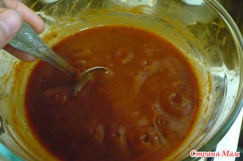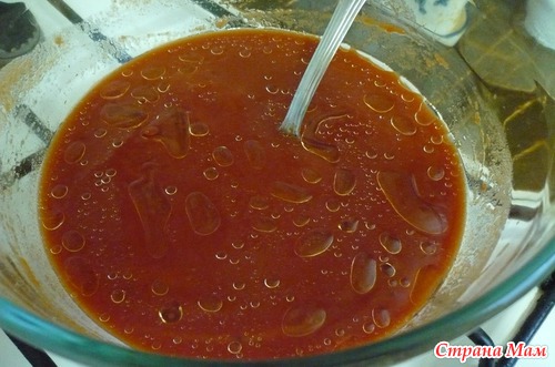 2 - Томатную пасту развести водой примерно 1:3 (все зависит от густоты пасты), она должна быть как томатный сок.