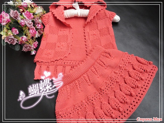Цветочки и листочки на костюме для дочки. Юбка и жилетка спицами.