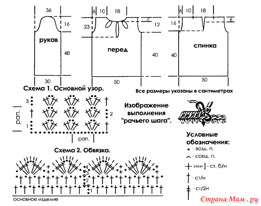 Обвязать низ рукавов, вырезы-«капельки» впереди и разрез на спинке 1-им р. ст. б/н и 1-им р. «рачьего шага» Обвязывая разрез на спинке сделать петельку для пуговицы - 4 в. п., пришить пуговицу. Выполнить обвязку горловины и низа изделия 1 -им р. ст. б/н, а затем узором по схеме 2.