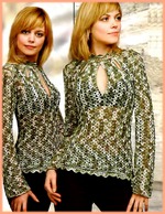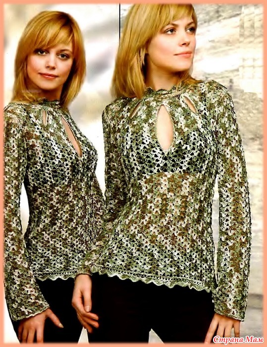 На 46-48 размер потребуется 500 г меланжевой пряжи зеленых оттенков; крючок № 2.
