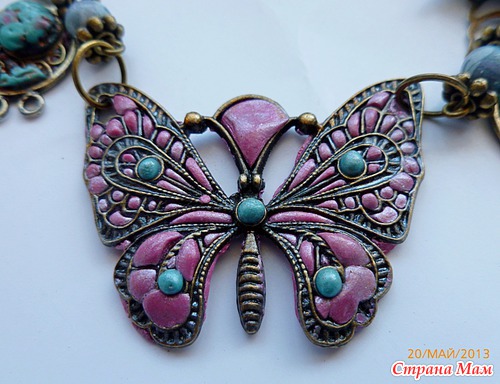 Предлагаю сделать колье "эмалевое " с бирюзовыми листочками. Сначала родим бабочку. Техника не новая, но эффектная. Пласт глины с тыльной стороны продавливается в тельце бабочки. Получаем "мелкие камушки"