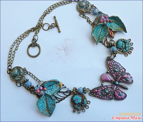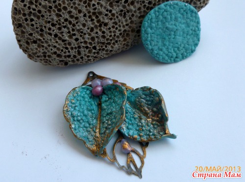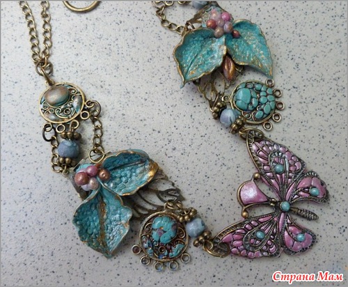 Предлагаю сделать колье "эмалевое " с бирюзовыми листочками. Сначала родим бабочку. Техника не новая, но эффектная. Пласт глины с тыльной стороны продавливается в тельце бабочки. Получаем "мелкие камушки"Листья будут из бирюзы.