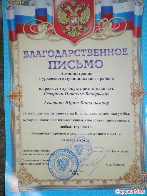 С нашего второго класса наградили 5 отличников. Родителям вручили благодарственные письма. Вот наше письмо, так приятненько