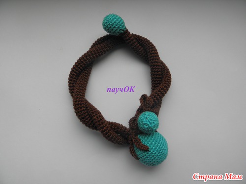 5. НЕ ЗАБУДЬТЕ ВСЕ ВРЕМЯ ПРИМЕРЯТЬ для определения размера трубы И ВЯЗАТЬ петли ПЕРЕД БУСИНОЙ ИЗ КОРИЧНЕВОЙ НИТИ , что-бы потом эти петельки использовать как застежки с мелкими бусинами. На фото где украшение складывается сердечком, видно, что бусины соеденены петелькой из цепочки в.п.