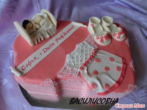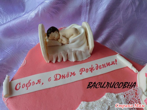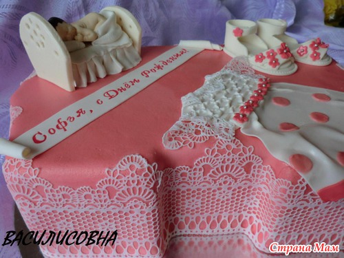пошли кружева в дело так сказать)))... тортик на годовасие, но клон с предыдущего делать не захотелось, хозяин торта, был не против чего-нить другого, ну вот я и натворила))) внутри сочинялка-ванильный шифон, и 2 крема, 2слоя сливочно-йогуртового с персиками, и сливочно шоколадный с апельсинками, вес 3800
