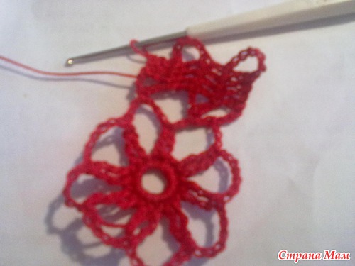 от середины последнего лепестка вяжу 14 ВП, поворачиваю вязание и вяжу 4 ССН в восьмую от крючка ВП, делаю 3 ВП и присоединяю к томуже лепестку, ещё 3 ВП и 4 ССН над ССН предыдущего ряда и т. д. по кругу, в каждый лепесток по два ушка