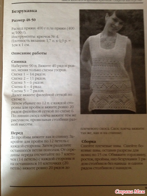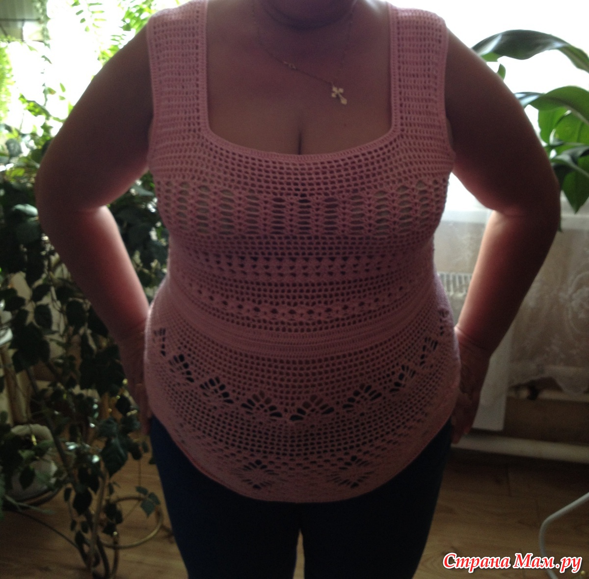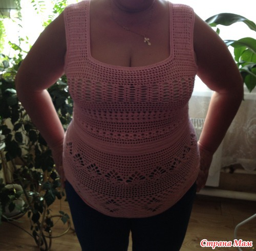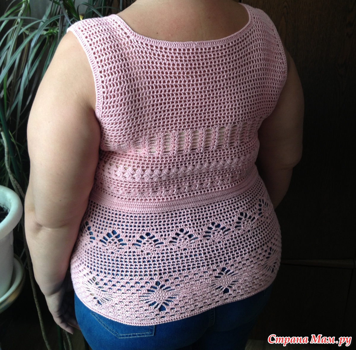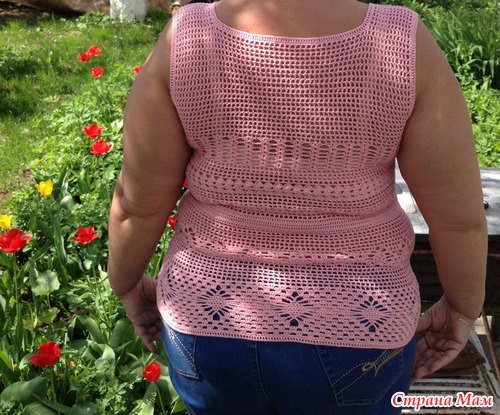 Очень понравилась эта маечка, и я решила ее связать. Нитки Семеновская Лилия цвет Роза, ушло 300гр(с небольшое яблоко остался моток), крючок 1.75 на 50-52 размер