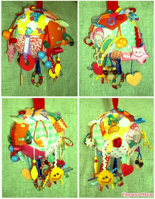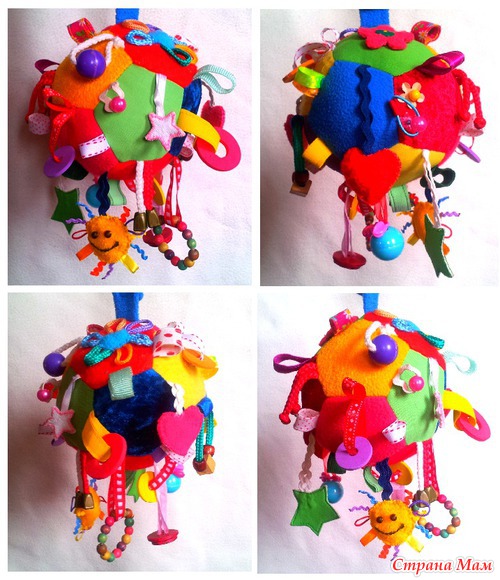 И на том, и на этом мячике куча шуршалок, звенелок, бусинок и других малышковых интересностей))). У моего малыша наш мячик уже два месяца любимая ненадоедающая игрушка! Да и моя двухлетняя племяшка, знаете ли, когда заезжаем, любит порой посидеть поразглядывать все эти сокровища!))) Так что у кого маленькие детки, - девочки, очень рекомендую!!! Мастер-класс Маши Комковой: http://komkofa.blogspot.com.es/2013/02/2.html