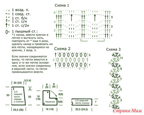 Плотность вязания. Основной узор: 23 ст. с/н и 12 р. = 10 х 10 см; ажурный узор А: 25 п. (во 2-м круг. р. схемы А) и 13 круг. р. = 10 х 10 см.
