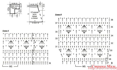 Нижняя часть переда и спинки: связать цепочку из 248 (264) 280 возд. п. и замкнуть их 1 соед. ст. в кольцо. Вязать ажурным узором А круг. р., начиная с левого бокового шва = 31 (33) 35 раппортов. Для формы в 14-м круг. р. от нижнего края убавить 6 раппортов, зачем пропустить 40 раз каждый 5-й и 8 раз - каждый 6-й ст. 6/н (* 1 раз 5-й и 1 раз каждый 6-й ст. б/н, повторить от * 23 раза) 40 раз каждый 6-й и 8 раз каждый 5-й ст. б/н = 200 (216) 232 п. либо 25 (27) 29 раппортов. В 26-м круг. р. от нижнего края убавить 5 раппортов, зачем 40 раз пропустить каждый 5-й ст. б/н (* 3 раза каждый 5-й и 2 раза каждый 6-й ст. б/н, повторить от * 7 раз) * 4 раза каждый 6-й и 1 раз след. 5-й ст. б/н, повторить от * 7 раз = 160 (176) 192 п. либо 20 (22) 24 раппорта. Через 22 см = 29 круг. р. от нижнего края поделить работу для разреза у перехода меж круг. р. и дальше вязать ажурным узором В прямыми и оборотными р., при всем этом в 30-м р. прибавить сначала р., как обозначено на схеме В, 1 п., а в конце р. - 2 п. = 163 (179) 195 п. в 31-м р. Через 7 см = 9 р. от начала разреза либо через 38 р. от начала схемы В вязать для планки под грудью только главным узором. Через 2,5 см = 3 р. от начала планки деталь окончить.