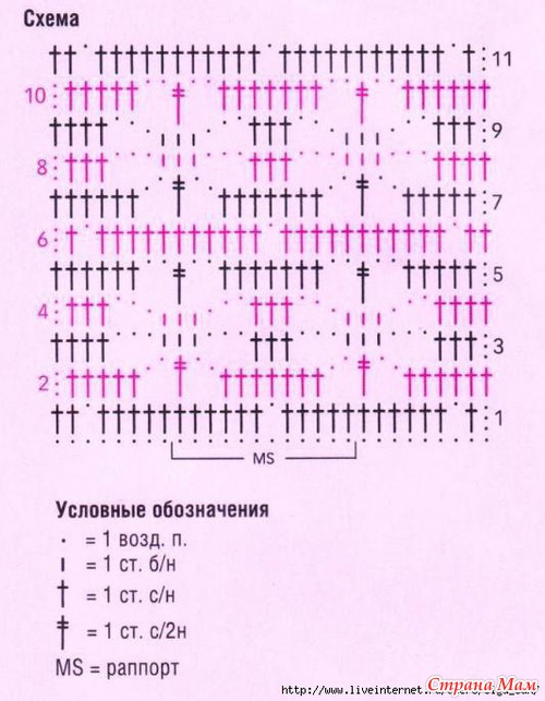 Кайма: вязать по схеме 3. Выполнить 1 раз с 1-го по 10-й р., повторять 9-й и 10-й р., закончить 11-м рядом.