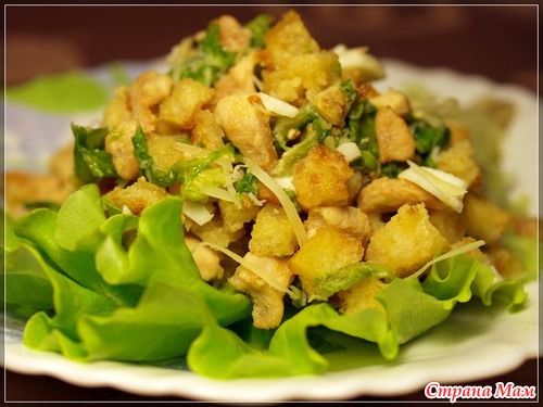 Разместите порванные листья салата, гренки и сыр на большой плоской салатнице. Полейте сверху приготовленной заправкой и слегка перемешайте.