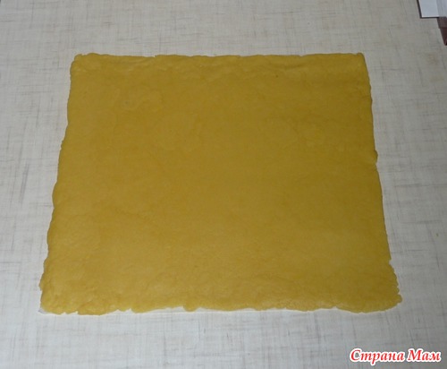 Отделить белок от желтка и замесить тесто. Тесто раскатать в пласт в виде прямоугольника, сверху выложить начинку и скатать рулет. Положить рулет в холодильник минут на 15-20, если надо быстро. Можно рулет в холодильнике оставить на ночь, а утром запечь.