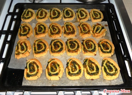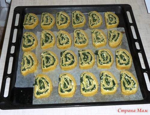 Духовку ставим на разогрев, примерно на 175-180 градусов. Охлажденный рулет режем на кусочки и выкладываем на противень с пергаментной бумагой. Отправляем в духовку на 30-35 минут. Рулетики сами подскажут Вам запахом, что они испеклись.