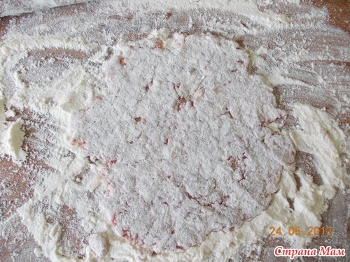 как катала я - сначала обваляла шарик в муке хорошо, потом руками делала лепешку, не забывая посыпать мукой, чтобы не липло, а потом уже лепешку раскатала потоньше, муки не жалела, она все равно вкуса не портит да и не чувствуется